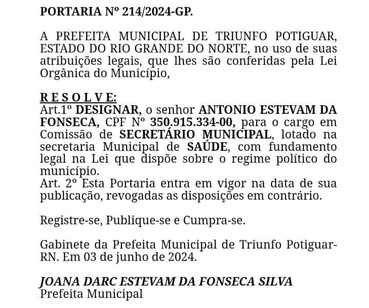 Prefeita de Triunfo Potiguar/RN, nomeia CONDENADO DA JUSTIÇA para ser Secretário de Saúde. (Processo n 0000252-70.2008.8.20.0137). A prefeita de Triunfo Potiguar nomeou para Secretario de Saúde...
